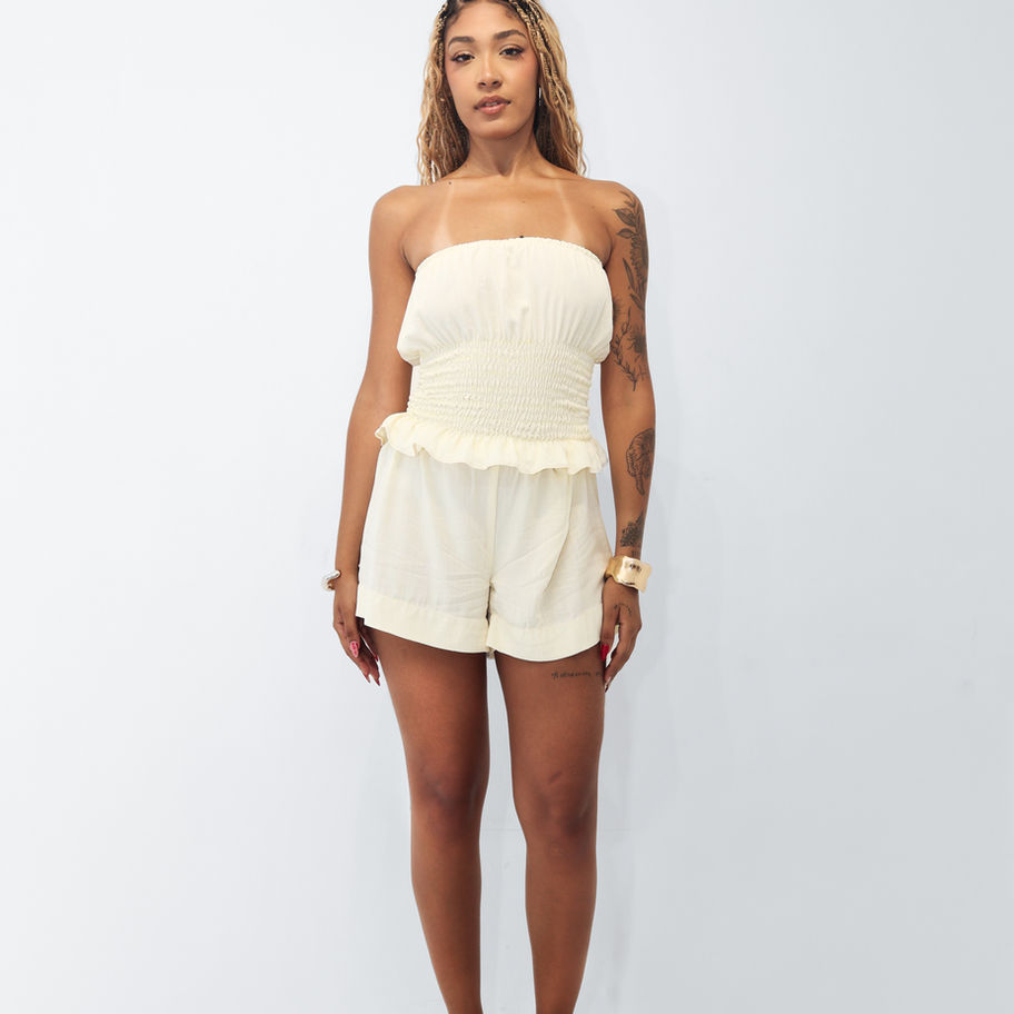 Blusa tomara-que-caia com corpo em lastex estruturado, garantindo firmeza e ajuste ao corpo.